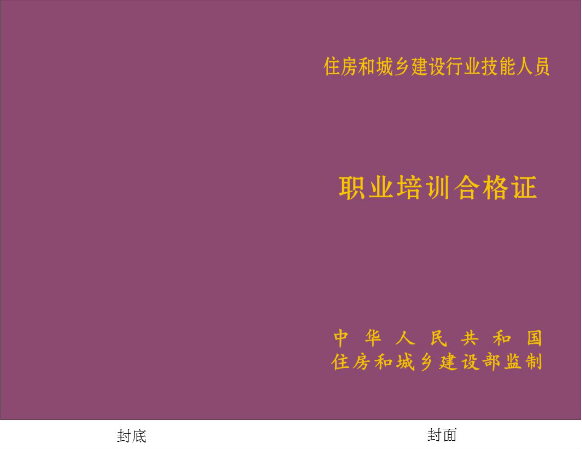 封面:“住房城鄉建設行業技能人員”字樣為宋體、三號、加粗,居中,段前40磅,段后40。“職業培訓合格證”字樣為宋體、二號、加粗,居中,段前60磅,段后80磅。“住房和城鄉建設部監制”字樣為宋體、四號、加粗,分散對齊,行距28磅,段前0磅,段后0磅封面字樣顏色模式均為RGB,紅色245,綠色205,藍色50。