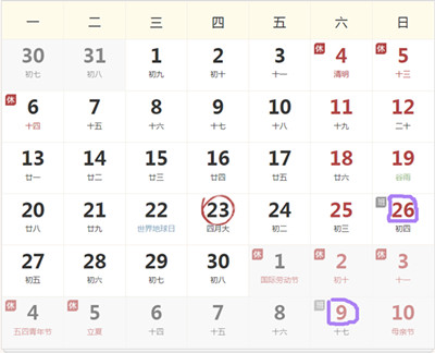 注:4月25日(星期六)全體休息,4月26日(星期日)正常上班。