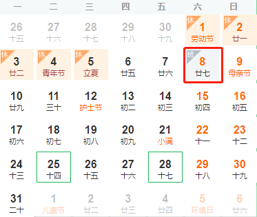 5月8日(星期六)正常上班,5月9日(星期日)全體休息。