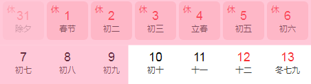 按照公司《員工手冊》規(guī)定,春節(jié)公司放假時間定為2022年1月29日(農(nóng)歷臘月二十七)至2022年2月9日(農(nóng)歷正月初九),共十二天,2022年2月10日(農(nóng)歷正月初十)正式報(bào)到上班。