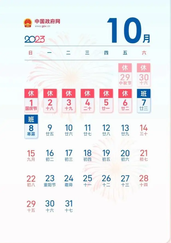 2023年9月29日(星期五)至10月6日(星期五)放假調(diào)休,共8天。10月7日(星期六)、10月8日(星期日)上班。提前預(yù)祝各位中秋、國慶雙節(jié)快樂!闔家團(tuán)圓!